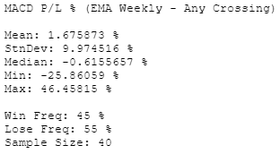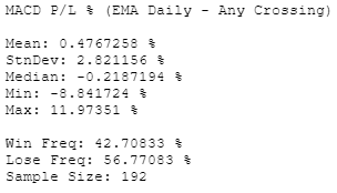 This first part of the MACD study series will backtest the variability of outcomes and compare the usage of an EMA vs a Simple Moving Average (SMA) over both daily and weekly timeframes of the SPDR S&P 500 ETF Trust (SPY). For now, the default periods of [12, 26, 9] will be used; different period settings will be tested in future parts of this MACD study series. The test will start from 01/01/2003 and will compare two different buying conditions: Any Crossing and Below Zero Line. Only long positions will be tested and will use closing prices to ensure the crossing event. All backtested trades' Profit/Loss Percentage (P/L %) summary statistics will then be analyzed and compared.