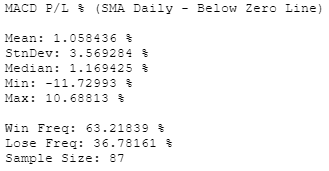 Although the Any Crossing condition was able to take two to three times as many trades as the Below Zero Line condition, the Below Zero Line trades performed significantly better; this suggests quality vs quantity. Therefore, buying when the MACD Line and Signal Line cross below the zero line could offer a higher probability of favorable results.